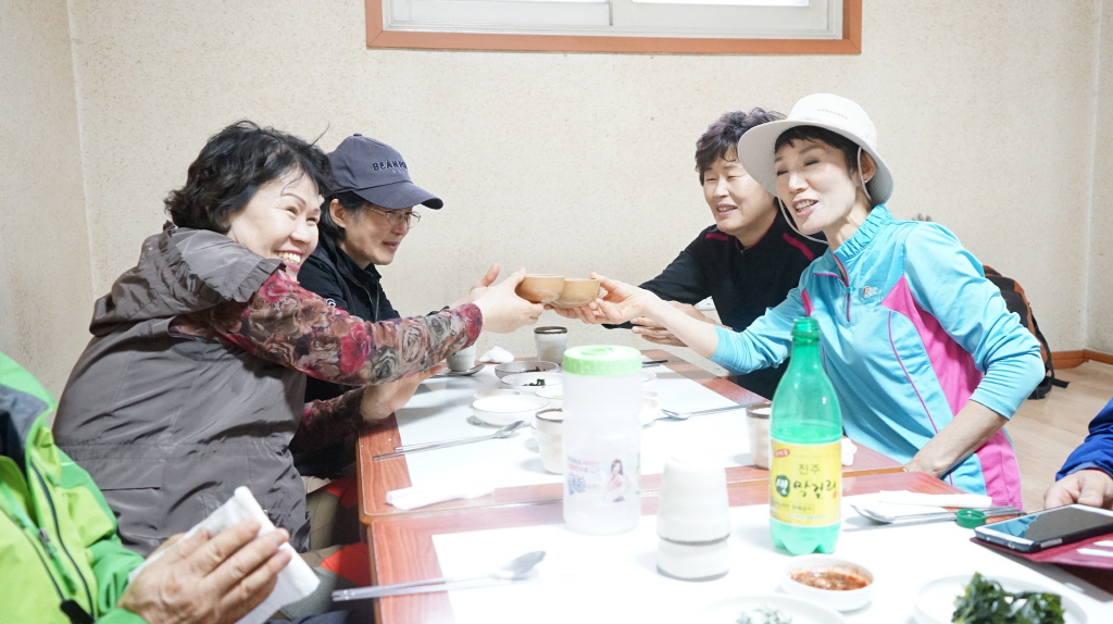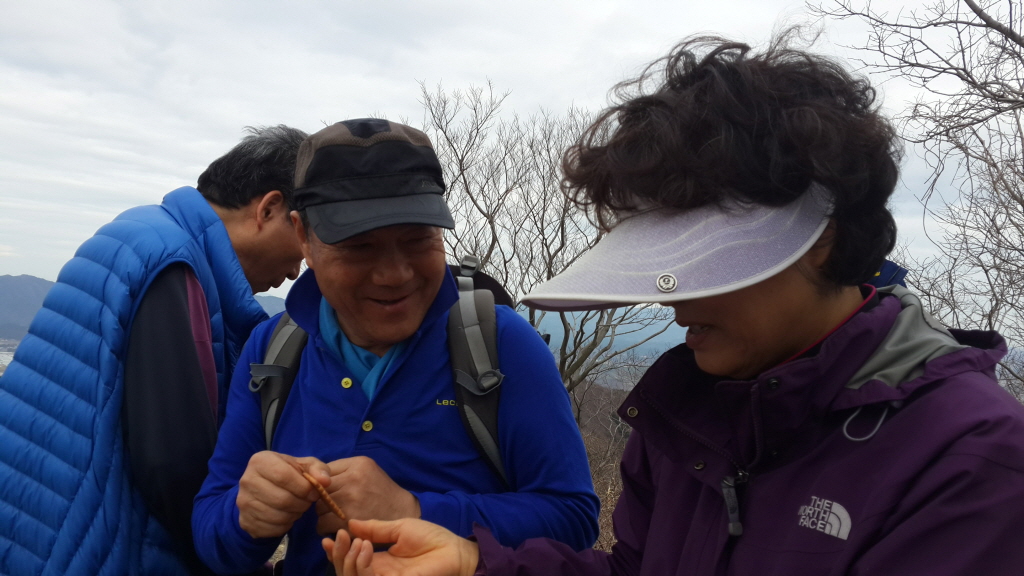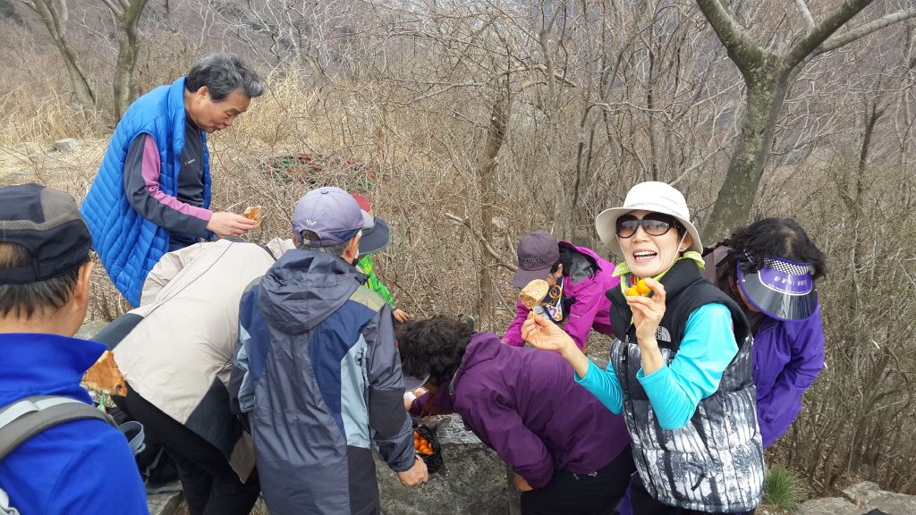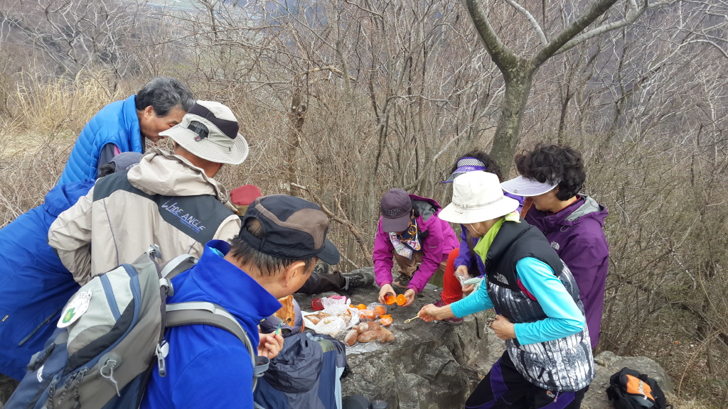 산 정상에서 준비해온 도토리묵, 빵, 강정, 비스켓,